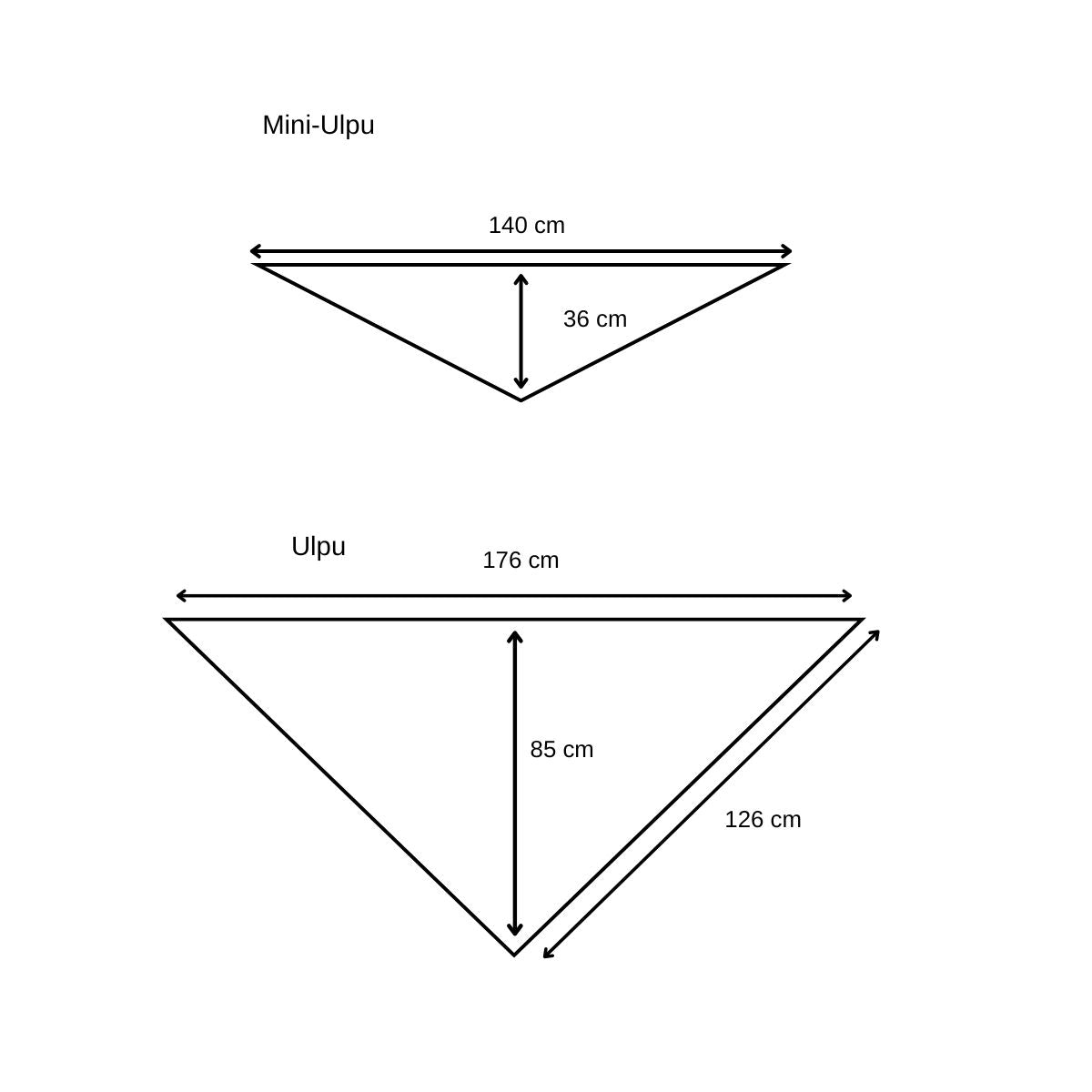 Ulpu on saanut nyt "pikkusiskon" Mini-Ulpun, joten kokoja on valittavissa kaksi vaihtoehtoa. Mini-Ulpu (75,00 €): Huivin pitkä sivu on 140 cm ja keskeltä alas 36 cm. Ulpu (99,00 €): Huivin pitkä sivu on 176 cm ja keskeltä alas 85 cm.